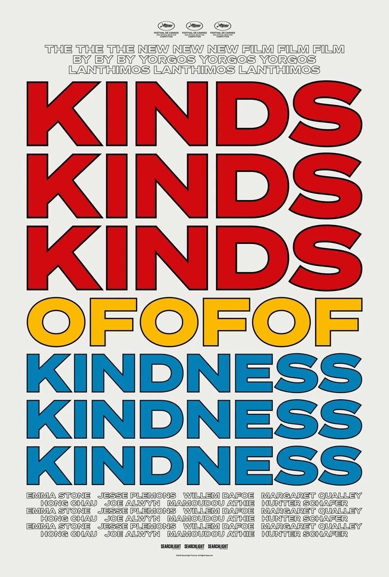 KINDS OF KINDNESS on kolmesta osasta rakentuva tarina, joka kertoo miehestä, jolla ei ole valinnanvapautta mutta joka haluaisi kuitenkin hallita itse omaa elämäänsä; poliisista, joka havahtuu siihen, että hänen merelle kadonnut vaimonsa palaa takaisin täysin muuttuneena; ja naisesta, joka on päättänyt löytää erään erityiskykyjä omaavan ihmisen, josta on tuleva suuri hengellinen johtaja. Elokuva valittiin Cannesin 77. elokuvajuhlien kilpasarjaan, jossa Jesse Plemons palkittiin parhaana miesnäyttelijänä. Elokuvan koira-ensemblelle myönnettiin myös "Mutt Moment" -palkinto.